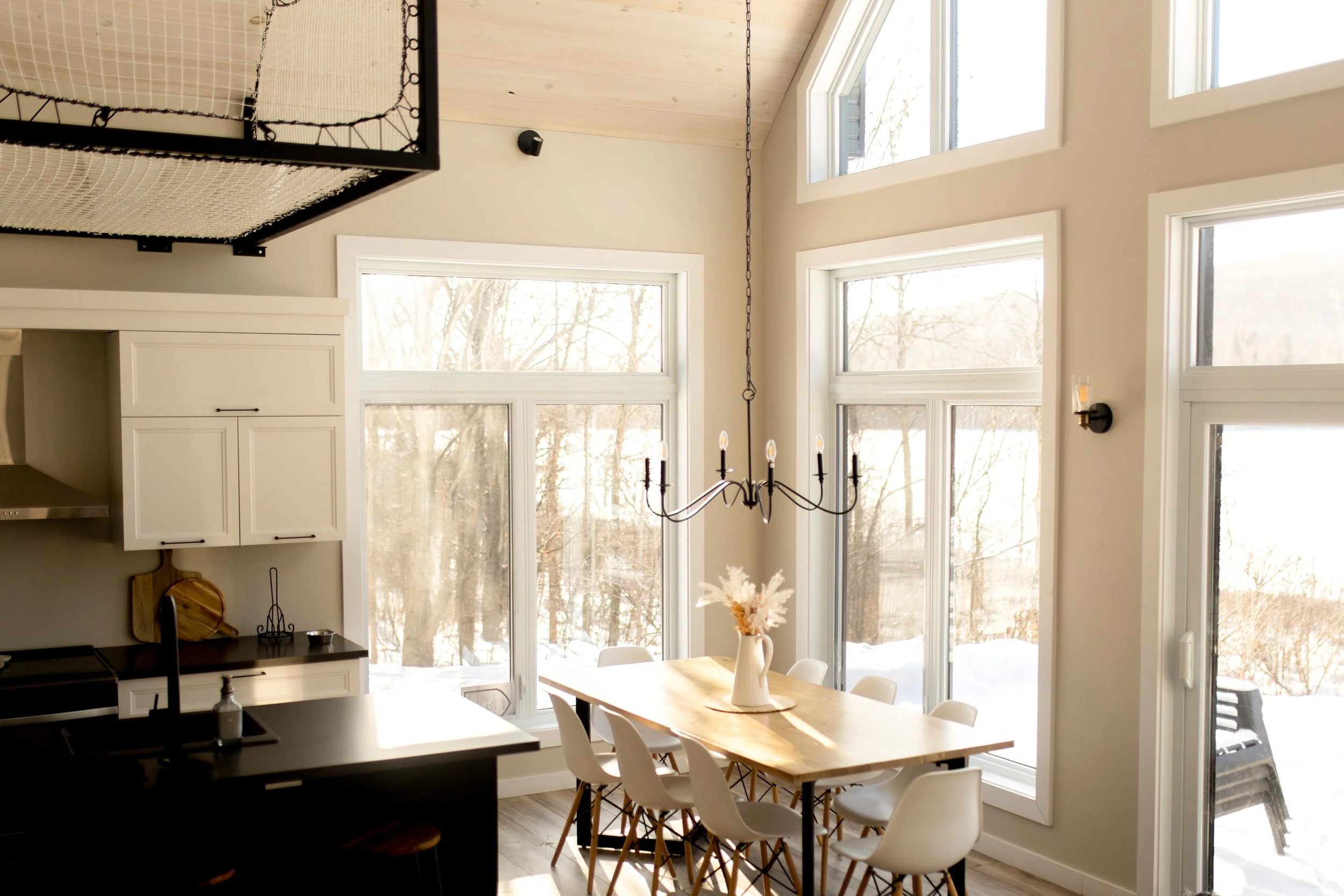 Au rez-de-chaussée, l'immense fenestration offre une vue imprenable sur le lac et les montagnes de la cuisine, salle à diner et salon. Un filet d'habitation suspendu du plafond vous permettra également de vous étendre et admirer la vue en hauteur!
